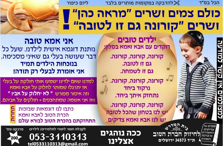 ביום הכיפורים, כשכולם צמים ושרים "מראה כהן", עולה קריאה לחיזוק האמונה והנהגות הבית: "קורונה גם זו לטובה". המסר המרכזי מתמקד בתפקידה של האם כמודל לחיקוי וביצירת אווירה של קדושה וביטחון בחיק המשפחה.