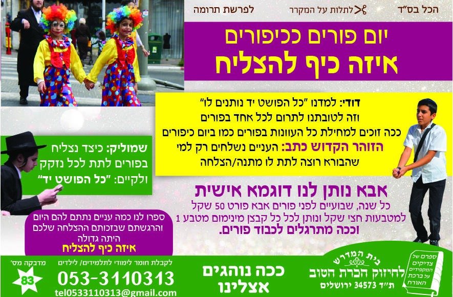 דודי למדנו כי "כל הפושט יד נותנים לו", וזה לטובתנו לתרום לכל אחד בפורים, כי כך זוכים למחילת כל העוונות בפורים כמו ביום כיפורים. הזוהר הקדוש כתב כי העניים נשלחים בפורים רק למי שהבורא רוצה לתת לו מתנה והצלחה. אבא נותן לנו דוגמה אישית: בכל שנה, שבועיים לפני פורים, הוא פורט 50 שקלים למטבעות של חצי שקל ונותן לכל קבצן מינימום מטבע אחד, וכך אנו מתרגלים לכבוד פורים. שמוליק שואל: כיצד נצליח בפורים לתת לכל נזקק ולקיים "כל הפושט יד"? ספרו לנו כמה עניים נתתם להם היום והרגשתם שבזכותם ההצלחה שלכם הייתה גדולה.