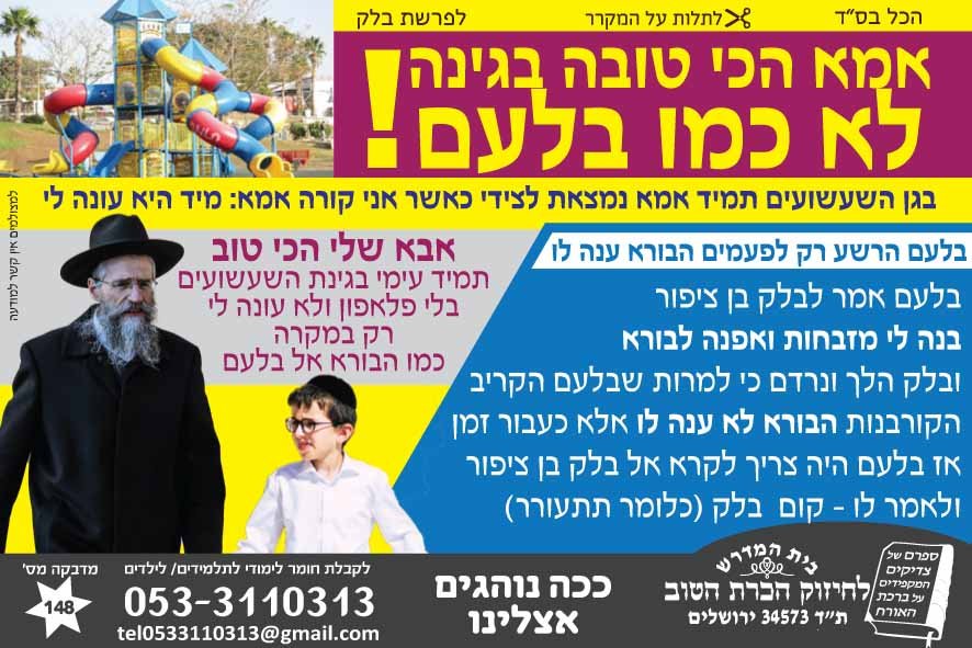 בגינת המשחקים, אמא טובה תמיד נמצאת לצד ילדיה, וכאשר הם קוראים לה – היא עונה מיד. בלעם הרשע זכה לתשובה מהבורא רק לפעמים, ואילו אצלנו אבא טוב נמצא תמיד עם ילדיו בגינה ועונה להם מיד, ללא טלפון נייד. בניגוד לבלעם שהיה צריך לקרוא לו "קום בלעם" (כלומר תתעורר), אבא שלנו ערני וקשוב לצרכי ילדיו בכל רגע.