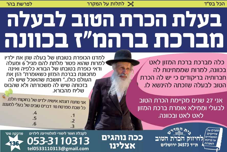 כלה שמעריכה את בעלה ומרגישה שיש לה הכרת הטוב על כך שזכתה להינשא לו, תרקוד ותשמח באמת. אמא טובה נותנת דוגמה אישית ומפרטת בכל שבת 10 דברים טובים של בעלה למענם. מי שמקיימת הכרת הטוב לבעלה, זוכה לומר ברכת המזון לאט ובכוונה.