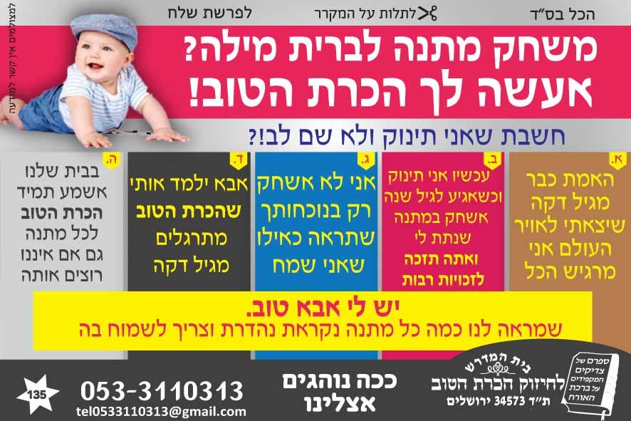 חשבת שאני תינוק ולא שם לב?! האמת היא שכבר מגיל דקה שיצאתי לאוויר העולם, אני מרגיש הכל. עכשיו אני תינוק, וכשאגיע לגיל שנה אשחק במתנה שנתת לי, ואתה תזכה לזכויות רבות. אני לא אשחק רק בנוכחותך כדי להראות שטוב לי; אבא ילמד אותי שהכרת הטוב מתרגלים מהרגע הראשון. בבית שלנו תמיד נשמע הכרת הטוב לכל מתנה, גם אם איננו רוצים אותה, כי אבא טוב מראה לנו שכל מתנה היא נהדרת וצריך לשמוח בה.